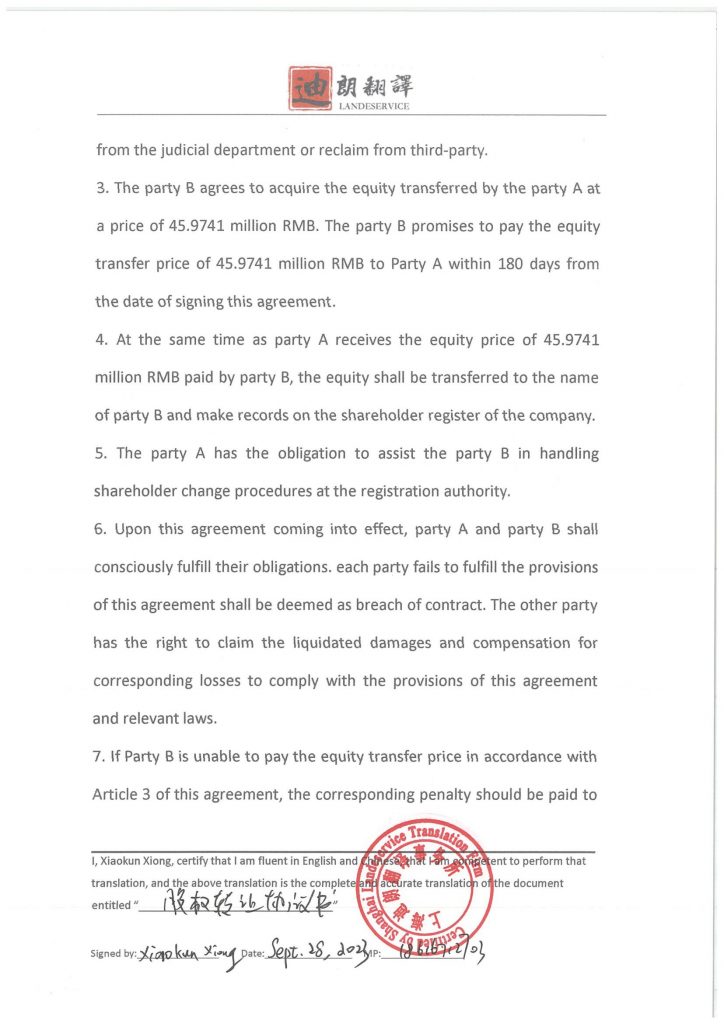 合同 文件類型 標書 翻譯案例 股權轉讓協議翻譯認證蓋章(中譯英) admin Posted on 2 years ago 微信或QQ掃一掃 Continue Reading Previous: 摩洛哥王國法院判決書翻譯認證蓋章(法譯中、英)Next: 上海離婚證翻譯認證蓋章 Related Stories 浦東 翻譯案例 美國死亡證明海牙認證書翻譯認證蓋章 admin Posted on 2 weeks ago 醫學 翻譯案例 美國馬薩諸塞州死亡證明翻譯認證蓋章 admin Posted on 2 weeks ago 浦東 翻譯案例 新加坡出生證落戶翻譯認證蓋章 admin Posted on 1 month ago
