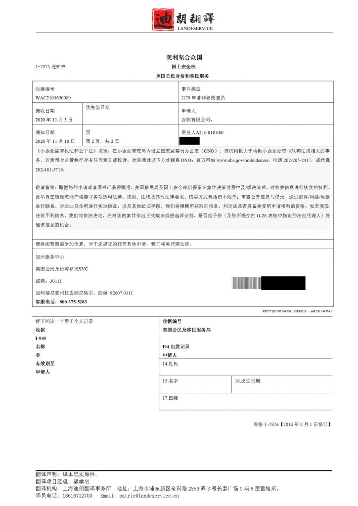 | I-797A通知書 國土安全部 |