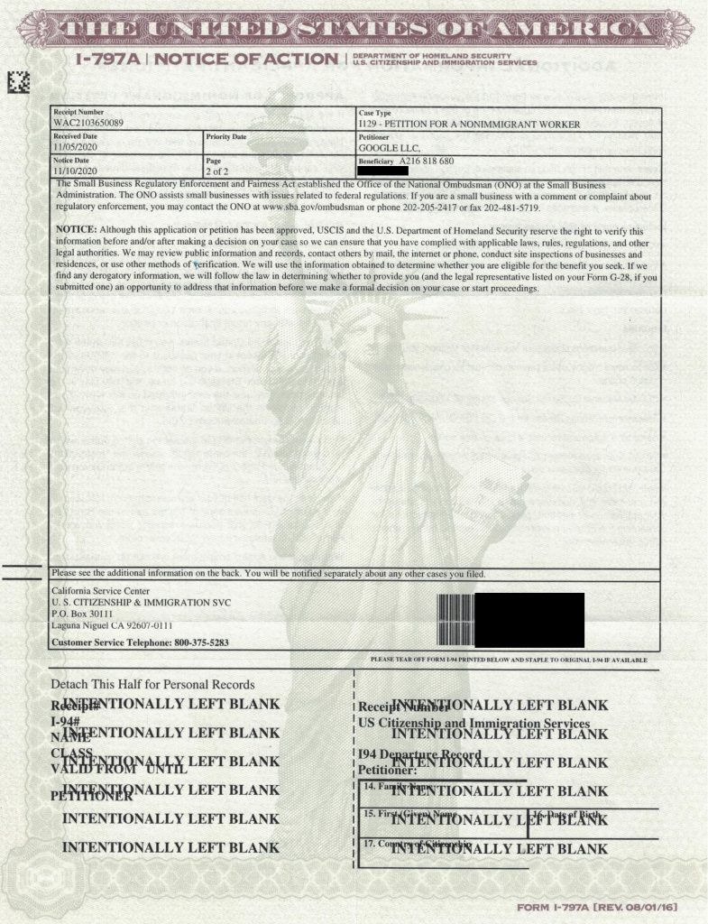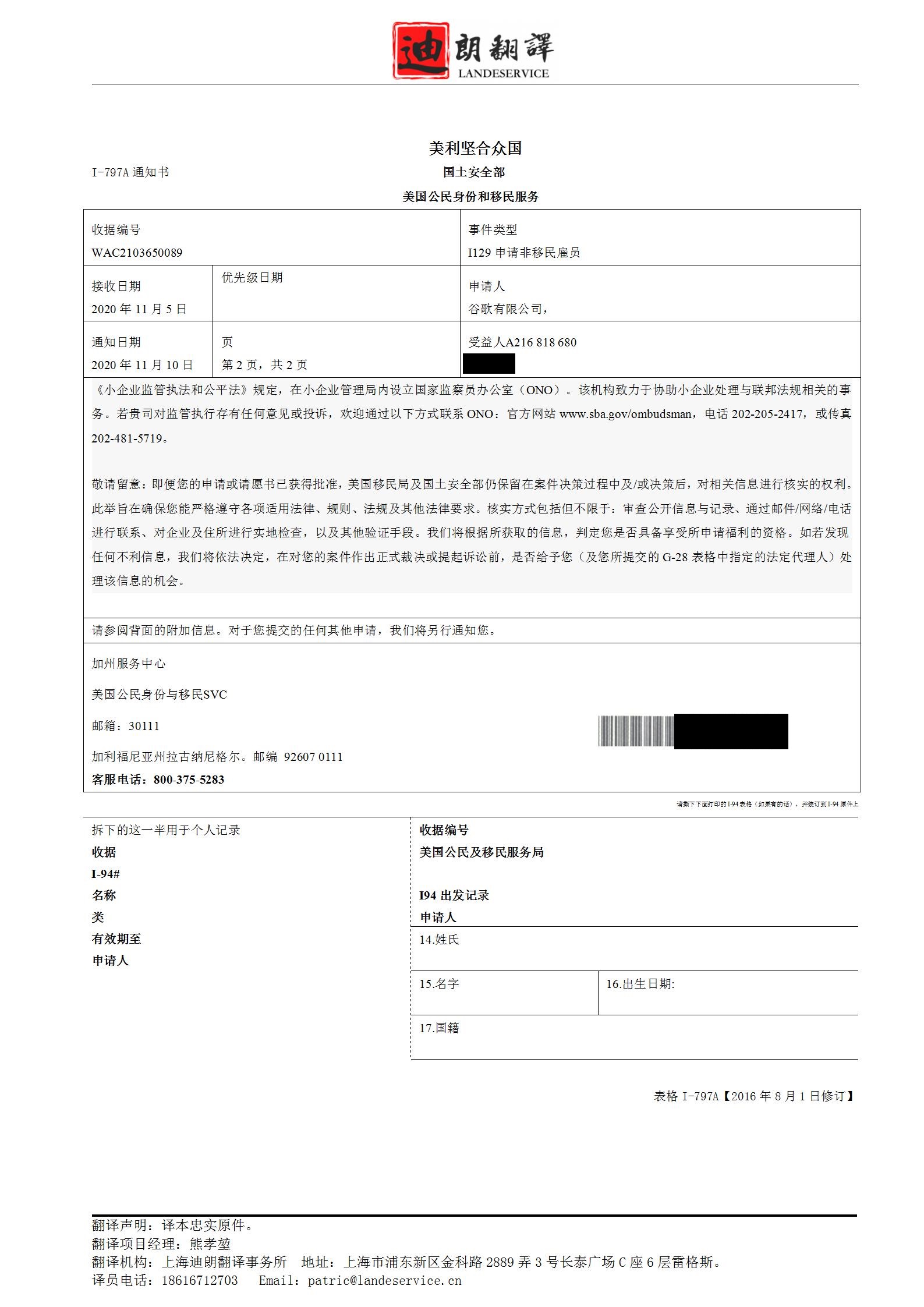 | 下面所附的I-94中的日期可能與上面的請愿書有效期不同,因為下面的I-94可能包含以下類別的請愿有效期前10天和后10天的寬限期:CW-1、E-1、E-2、E-3、H-1B、H-2B、H-3、L-1A、L-L-IB、O-1、O-2、P-1、P-1S、P-2、P-2S、P-3、P-3S、TN-1和TN-2。 |