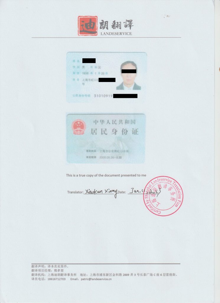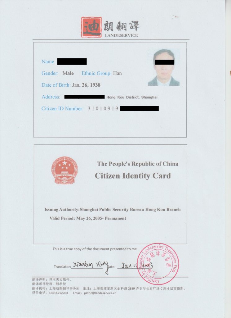 - 上海身份證翻譯認證蓋章(中譯英|出國、留學、移民用途)